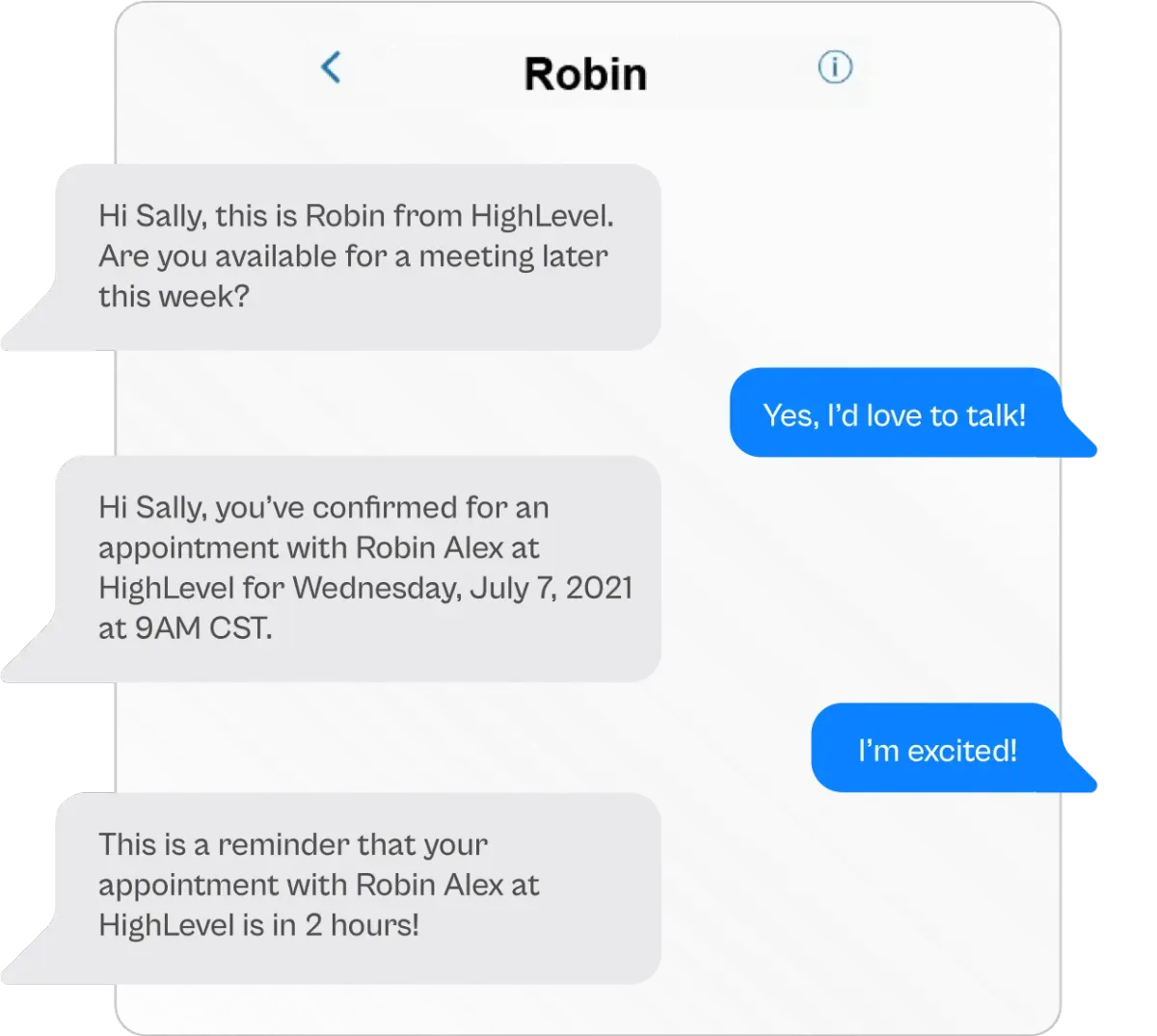 أرسل رسائل تلقائية (Automated Messages) عبر البريد الإلكتروني، الرسائل النصية (SMS)، المكالمات الصوتية، ورسائل Facebook Messenger والمزيد — كل هذا يتم تلقائيًا للحفاظ على تفاعل مستمر مع عملائك.
