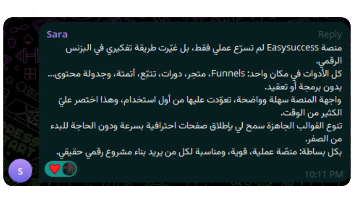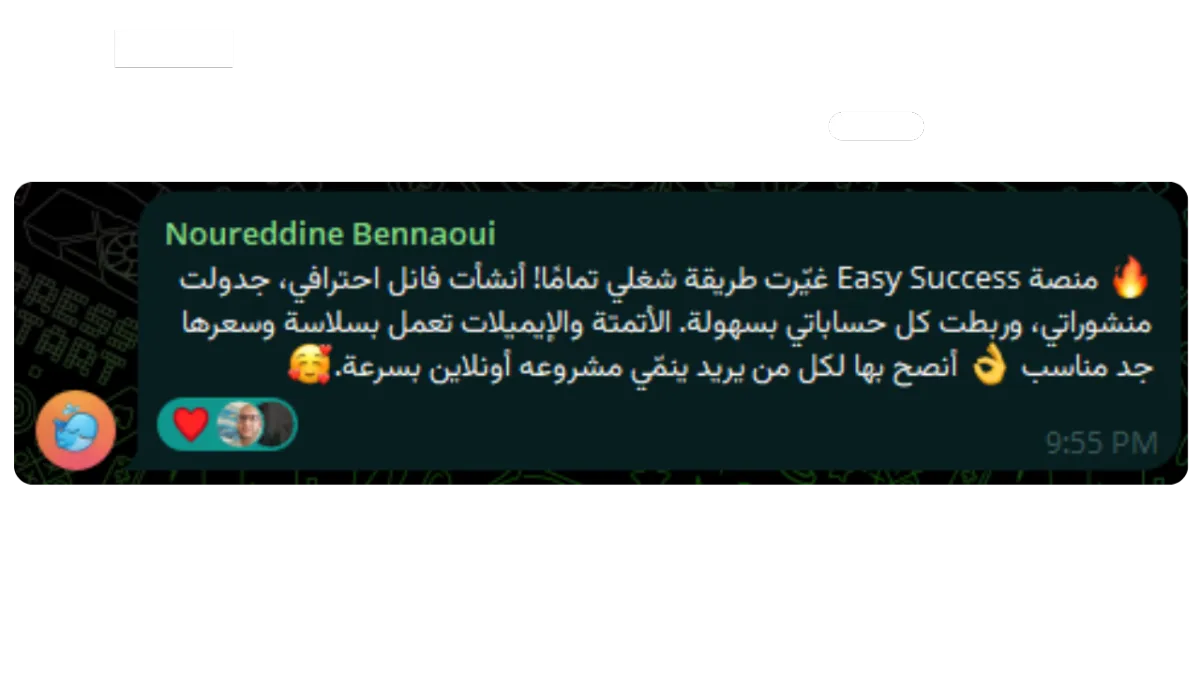 تم تصميم Easysuxess خصيصًا لتلبية احتياجات رواد الأعمال و المشاريع الرقمية الذين يبحثون عن البساطة، السرعة، والنتائج الفعلية.
